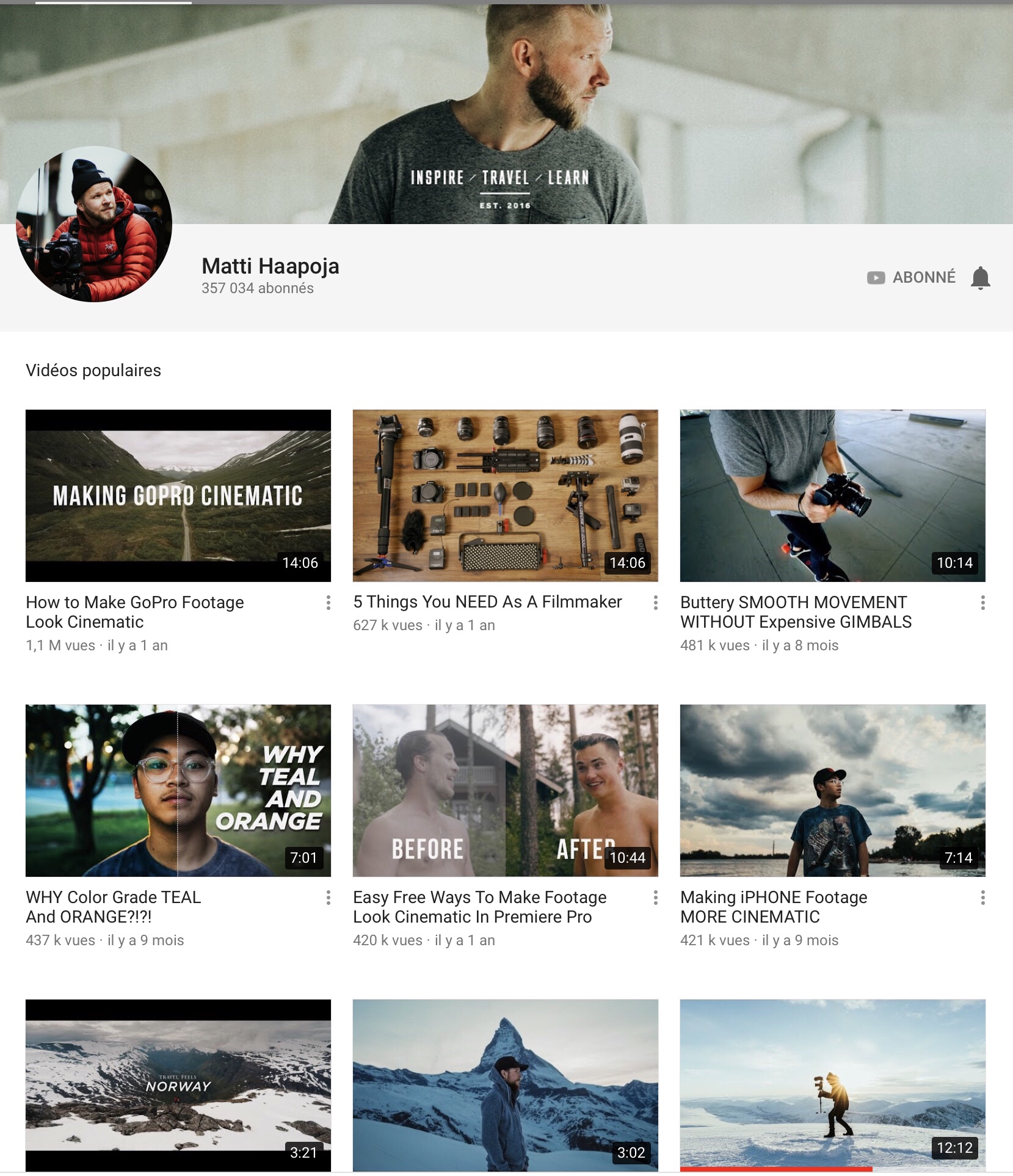 YouTuber et Filmaker canadien de talent . Cette chaine regorge de tutos , de présentations de matériels photos et vidéos , mais aussi énormément de videos de voyages magnifiques .