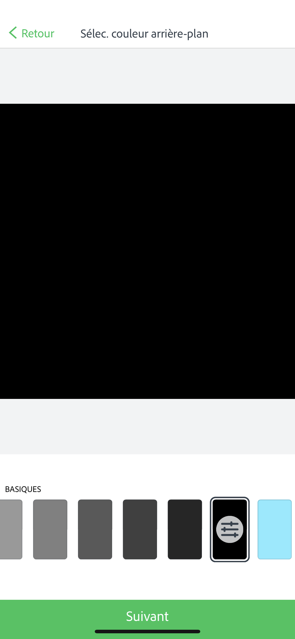 Puis, choisissez la couleur de votre fond, pour l’exemple, et car c’est ce que j’utilise sur mon profil instagram, je vais ici choisir le noir, puis appuyez sur suivant.