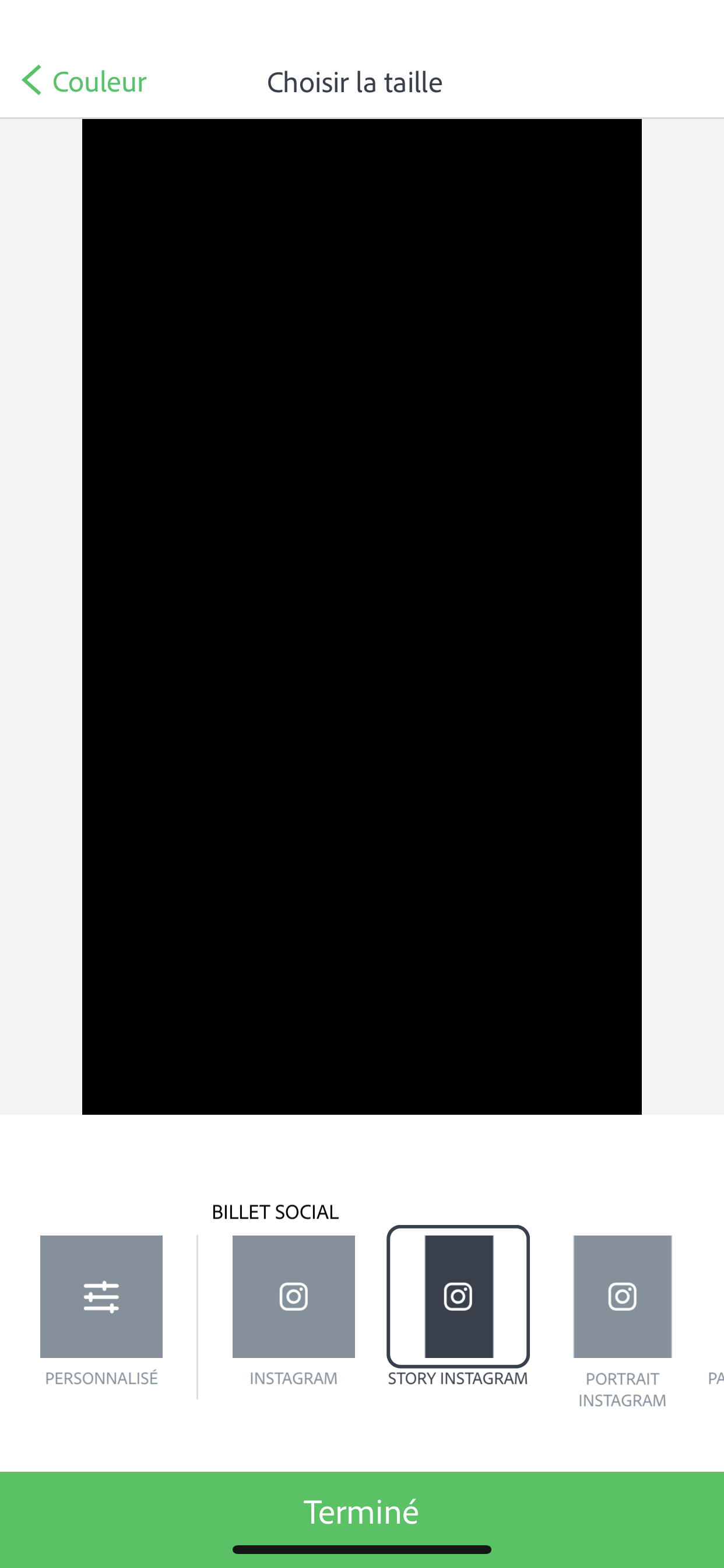 Après cela , vous devrez choisir le format de votre image, d’après les essais que j’ai fait, pour que votre image ou votre texte soit bien centré, le format le plus adéquat et le format story instagram, ensuite, appuyez sur terminé.