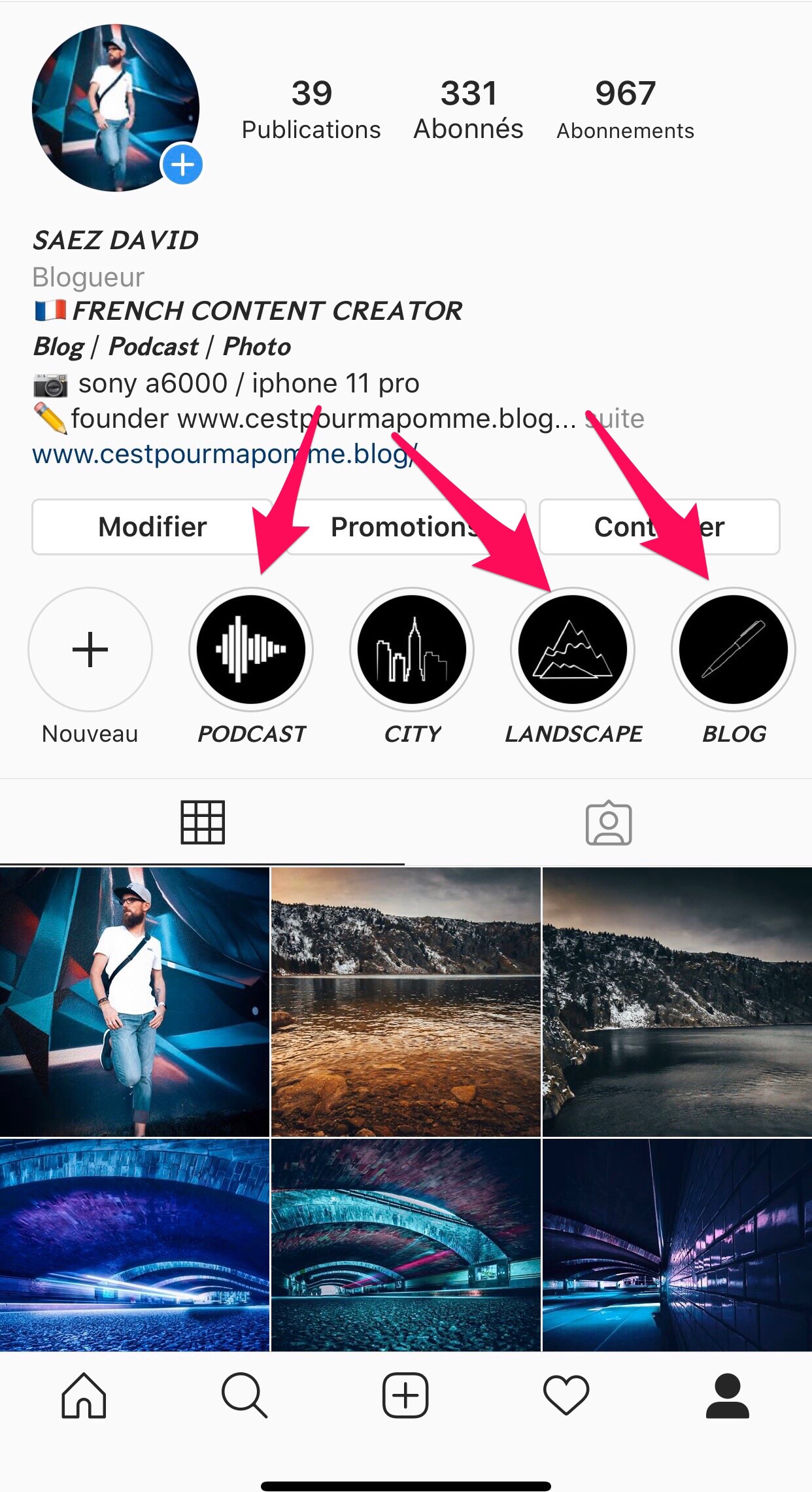 les highlights sont ces images « à la une « que vous retrouvez en haut de votre profil instagram, ce sont des stories qui sont enregistrées et qui sont visibles continuellement, contrairement aux autres stories qui disparaissent au bout de 24 heures .
