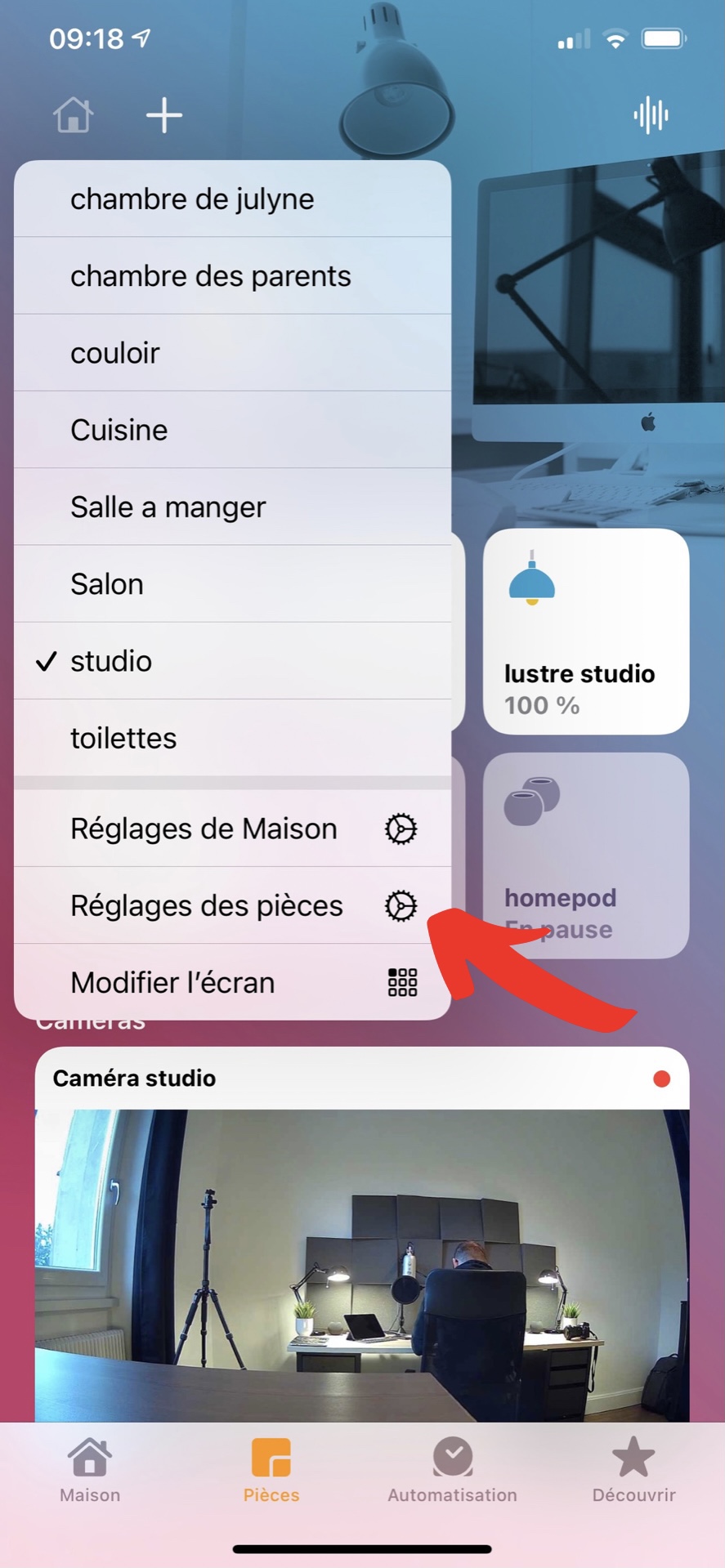 Vous arriverez alors sur un menu déroulant, choisissez réglages des pièces, qui va vous ouvrir une seconde page.