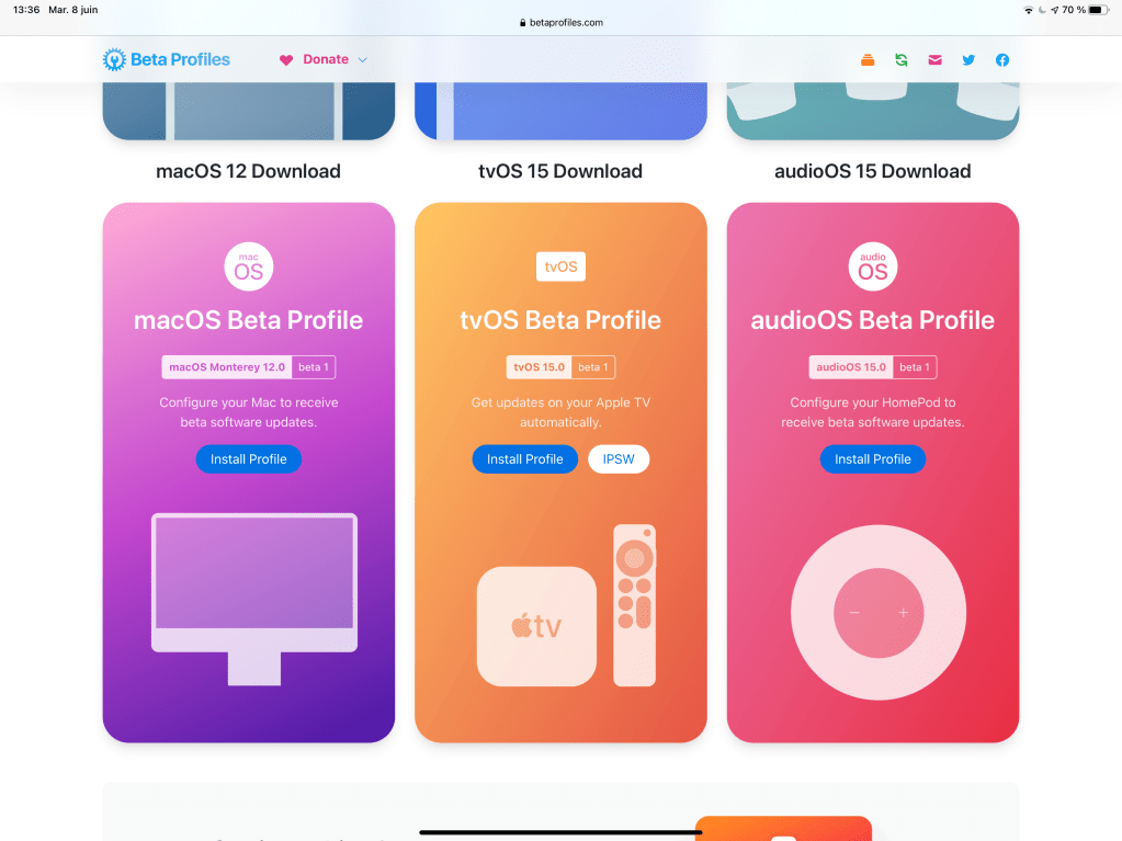 Téléchargez la version de l’OS dont vous avez besoin ( iOS, iPadOS , watchOS , tvOS , macOS ). En téléchargeant ce fichier, vous allez télécharger un profil que vous pourrez retrouver dans RÉGLAGES / GÉNÉRAL ( en bas de la page ) .