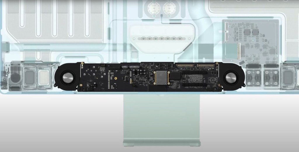 Avec l’arrivée des puce M … , le design Hardware à l’intérieur des machines est totalement revu et prend beaucoup moins de place , exemple avec l’intérieur des derniers iMac .