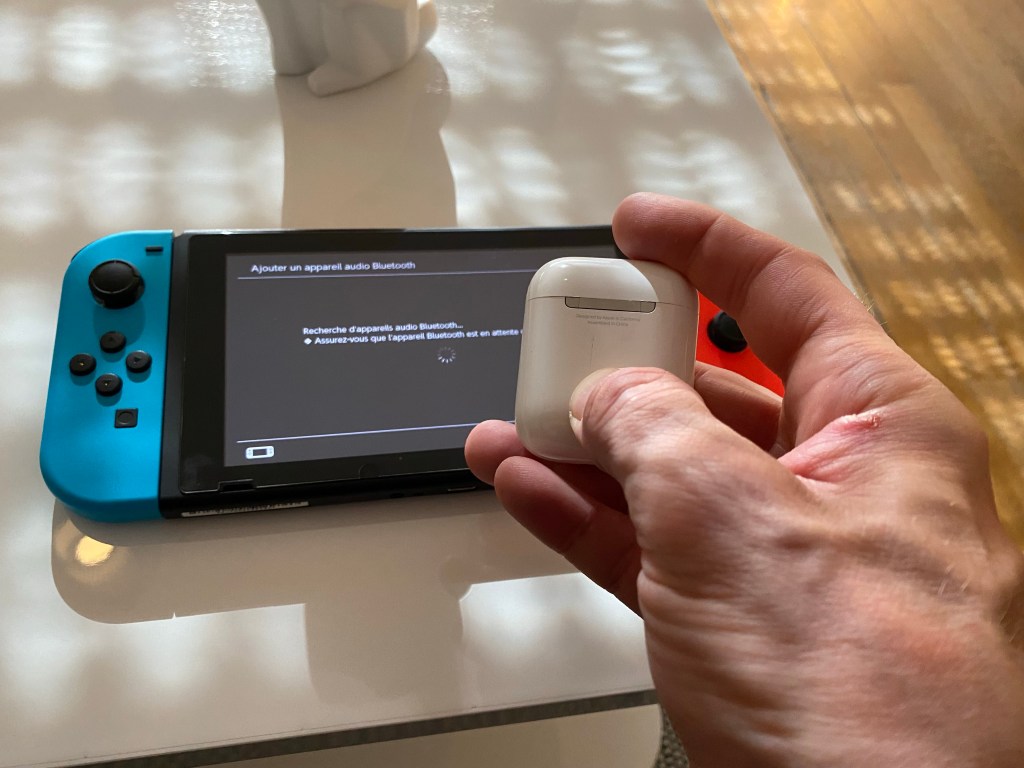 Puis pour appairer vos AirPods, il vous suffit de rester appuyé sur le bouton à l’arrière du boîtier des AirPods, le temps que la nintendo switch les détecte.
