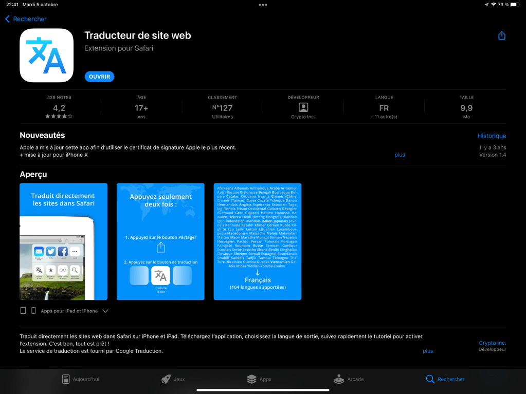 Cette quatrième extension vous permet de traduire n’importe quel site web à la volée, et plutôt de façon assez convaincante , là ou j’ai vraiment l’impression que la version native de safari a beaucoup de mal parfois .