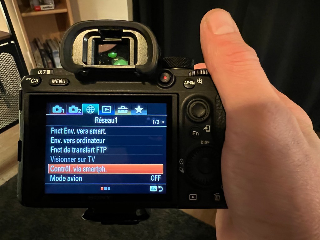 Ensuite lancer l’application et dans le même temps , rendez vous dans le menu de votre appareil photo pour chercher l’option contrôler via smartphone.