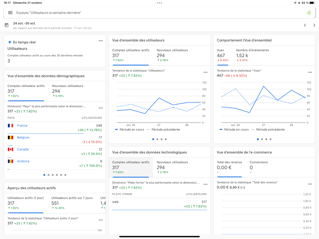 Ensuite , il y a GOOGLE ANALYTICS, que je n’utilise que très rarement mais, il est vrai que les stats du blog sont un peu plus complètes à cet endroit là que dans l’application WORDPRESS donc, j’aime bien l’avoir sous la main pour pouvoir y jeter un coup d’œil de temps en temps.