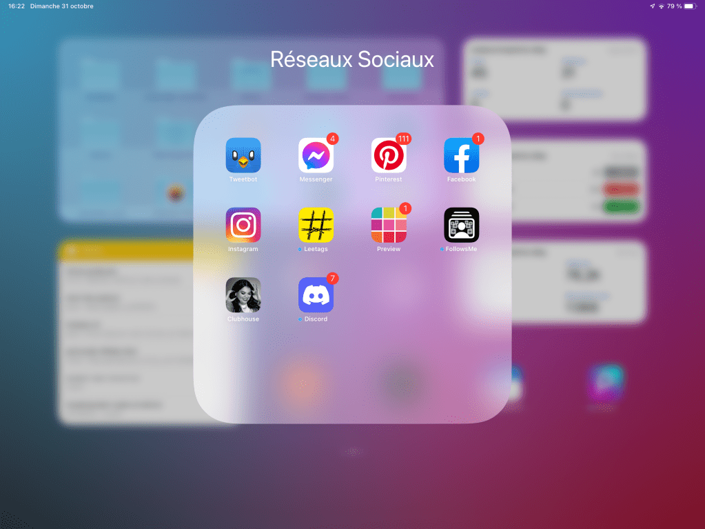 Et pour finir ce petit tour exhaustif du dock de mon iPad, j’ai un dossier dans lequel je range toutes mes applications de réseaux sociaux pour avoir tout au même endroit et assez facile d’accès car disponible peu importe sur quelle page de mon iPad je me trouve.
