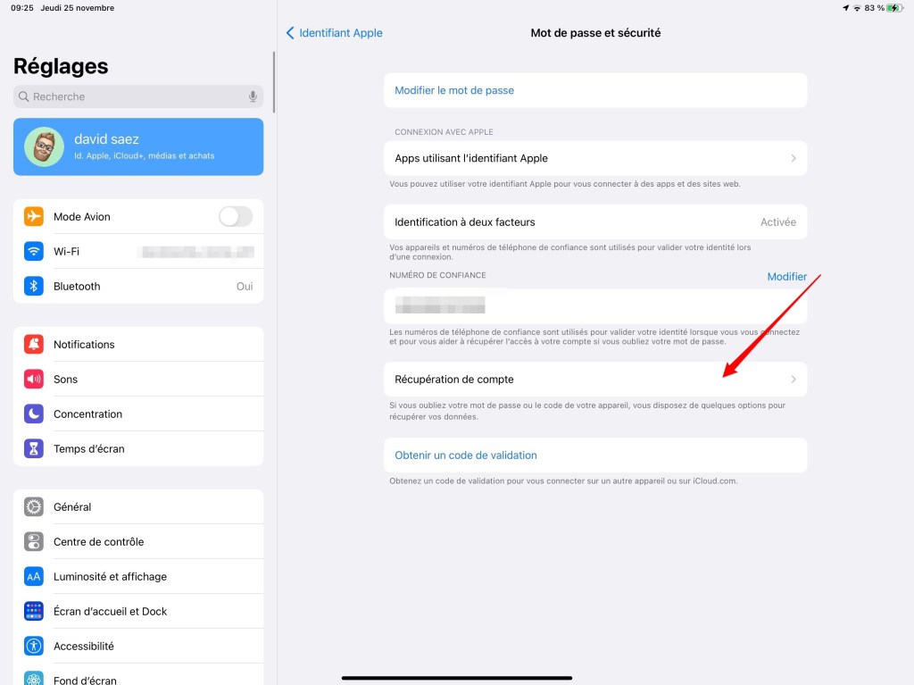 Sur son appareil tournant au moins sous iOS / iPadOS 15, le contact devra accéder à Réglages—> Apple ID—- > Mot de passe et sécurité —> Récupération de compte —-> le nom du contact, puis Obtenir le code de récupération.