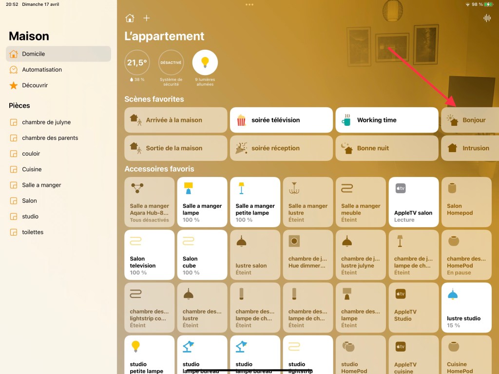 Je suis donc passé dans l’application Maison, choisi exactement les lumières que je voulais allumer et à quelle intensité, et j’en créer une scène spécifique que j’ai appelé bonjour .