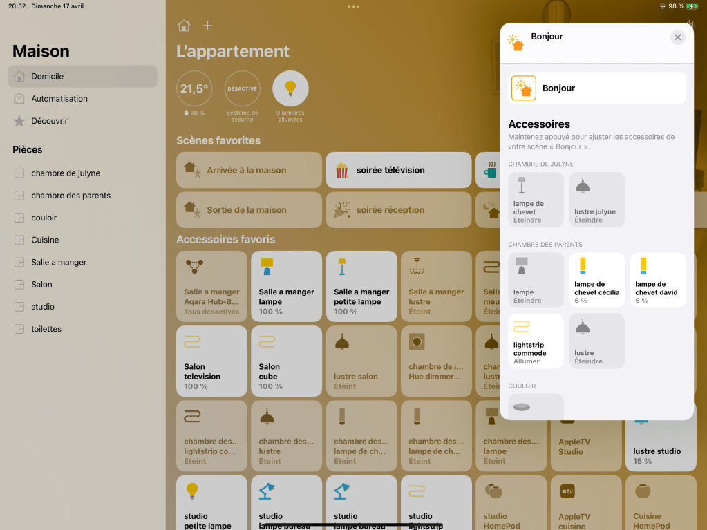 C’est un simple raccourci qui dès que je dis « bonne journée « au HomePod mini qui se trouve dans ma chambre à coucher, va allumer quelques lumières dans la pièce sans nous éblouir dès le réveil, va nous dire bonjour à moi et à ma compagne, va nous énoncer un petit texte prédéfini et va finir par nous donner la météo du jour pour savoir comment on va s’habiller avant même de se lever.
