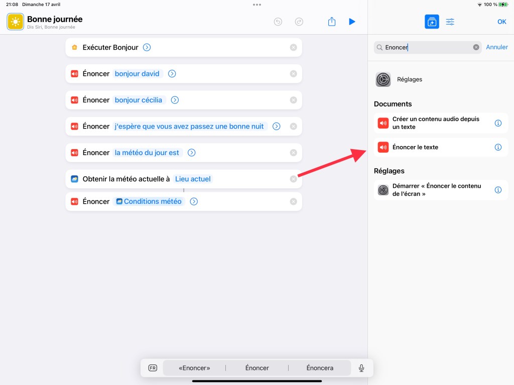 Et la dernière ligne de ce raccourci étant, encore , Énoncer le texte , mais au lieu de lui faire énoncer un texte défini par mes soins, je lui demande tout simplement d’énoncer les conditions météo qu’il a obtenu juste avant.