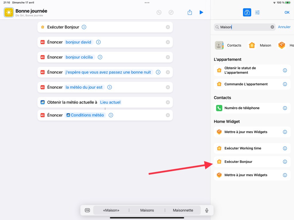 Vous le voyez , et je vous l’avais dit, ce raccourci est assez simple à mettre en place, dans cette configuration, et maintenant le matin, quand je dis « Dis Siri, bonne journée « l’HomePod mini énonce le texte que je lui ai demandé et il termine par nous donner la météo du jour.