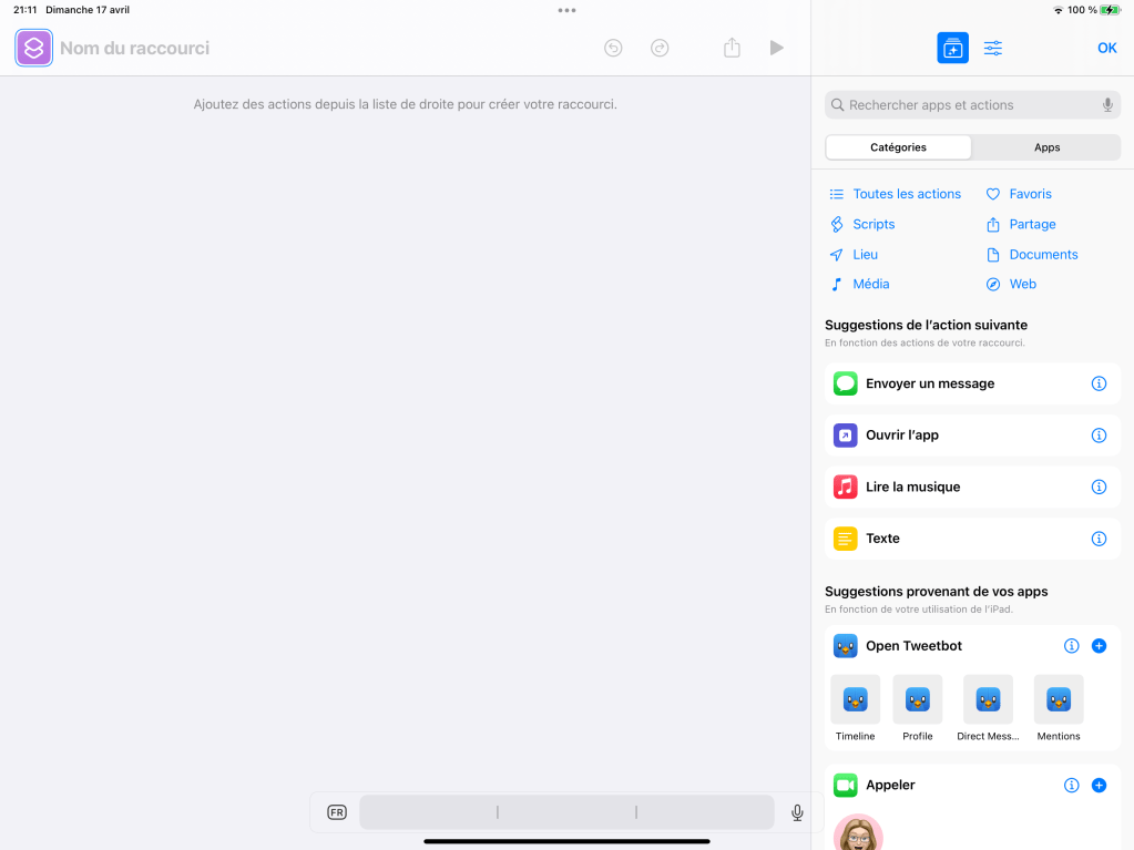 Une fois cette petite scène (très simple) créée, on peut maintenant passer dans l’application Raccourcis pour continuer.