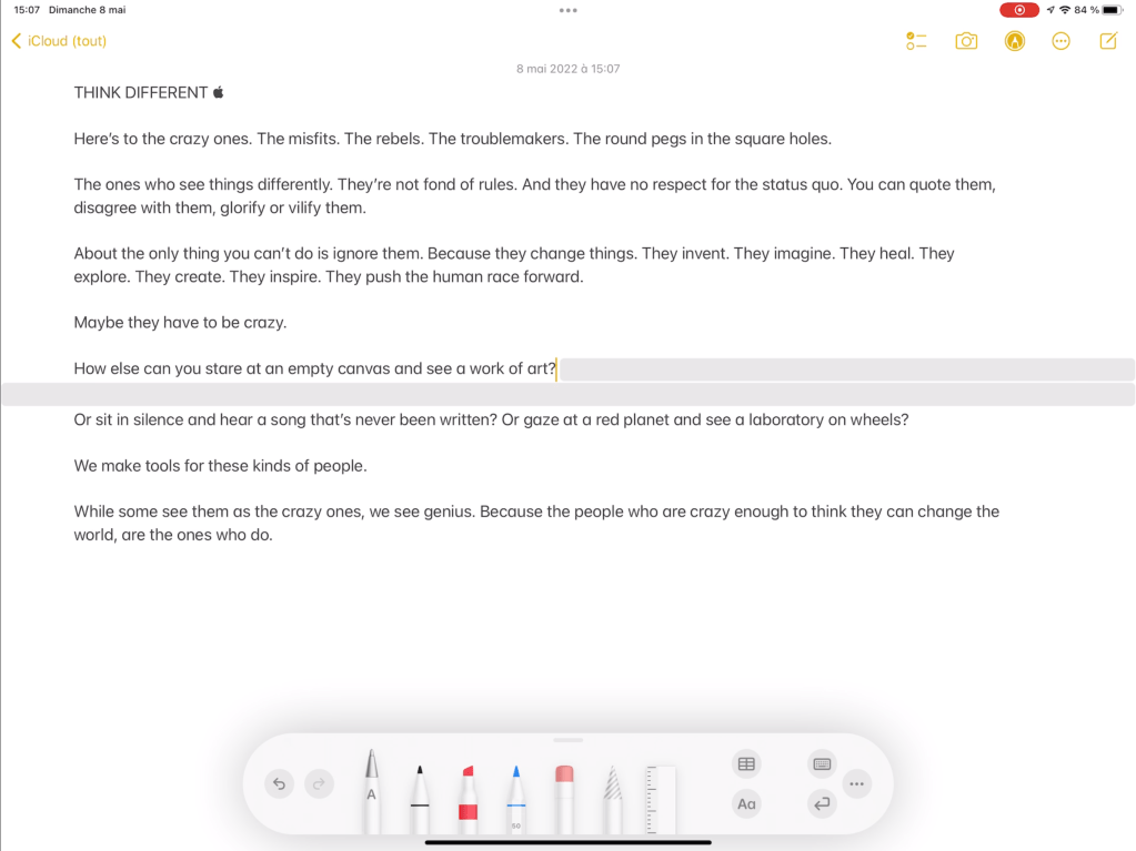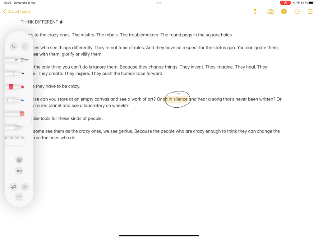 Pour sélectionner un mot ou une phrase dans un texte, il vous suffit simplement de l’entourer à l’aide de l’Apple pencil ou bien de tracer un trait à travers ce mot ou cette phrase.
