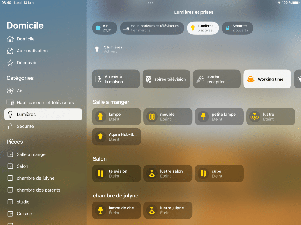 Vous chercher une lumière, cliquez sur lumières, et vous trouverez l’ensemble des éclairages de votre maison, pareil pour les différents capteurs de température ou de mouvement.