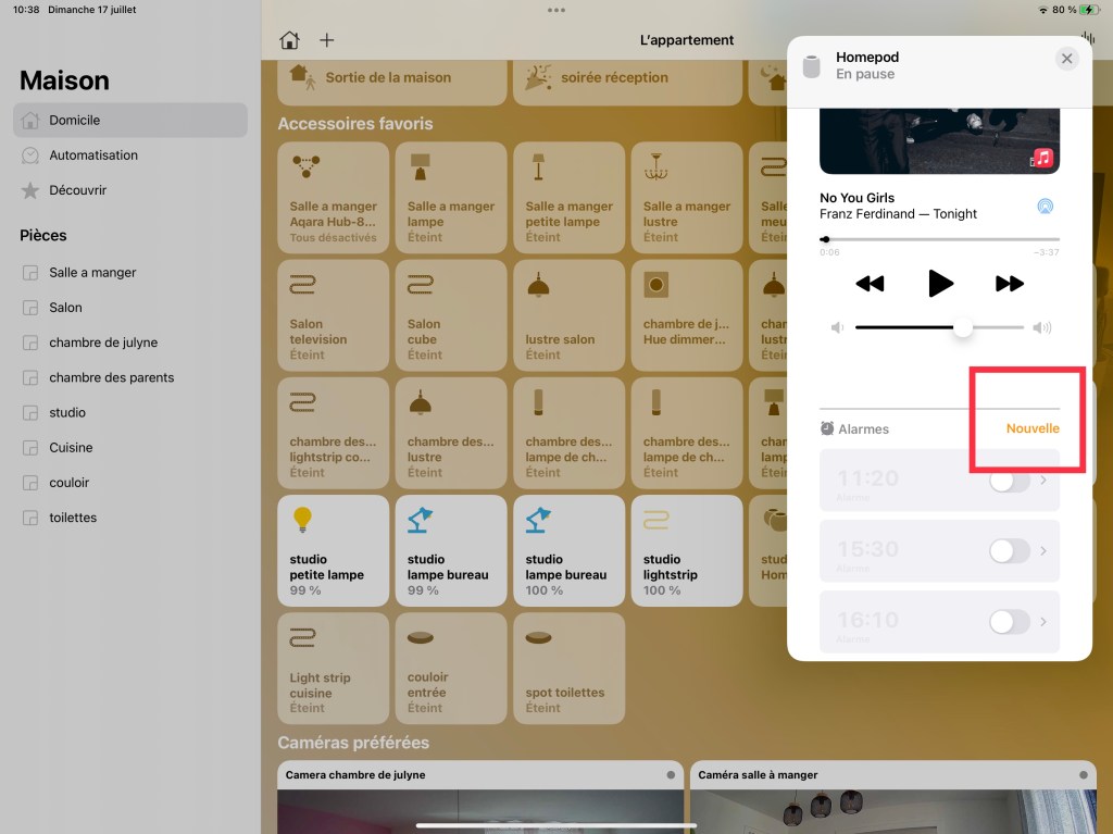 – Maintenez l’icône du HomePod enfoncé et une fois dans les réglages, rendez vous dans la section Alarmes puis cliquez sur Nouvelles .