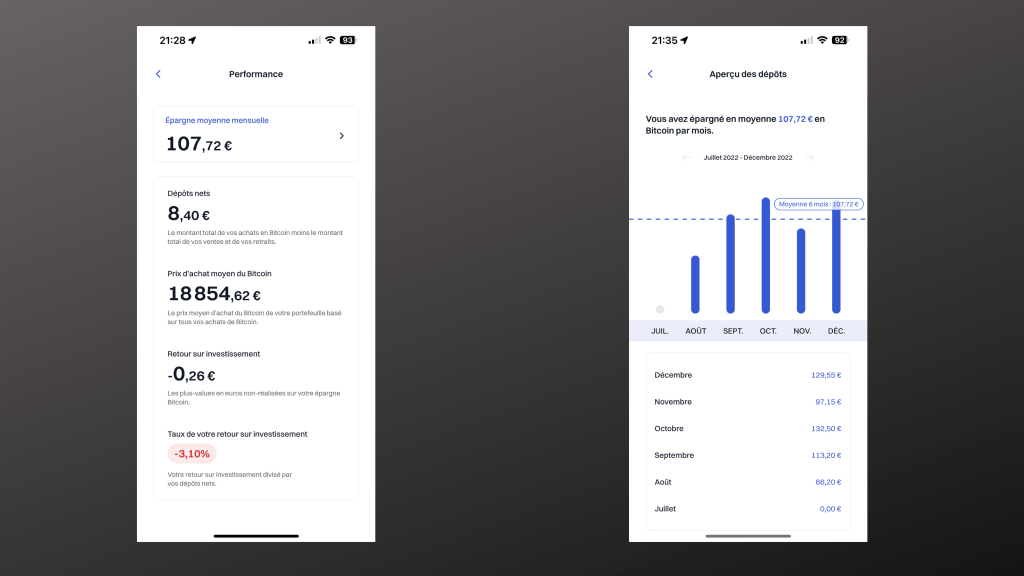– votre portefeuille, avec une vue d’ensemble de tout ce que vous avez déjà épargné, mais aussi la valeur en temps réel du bitcoin et tout un tas d’autres informations