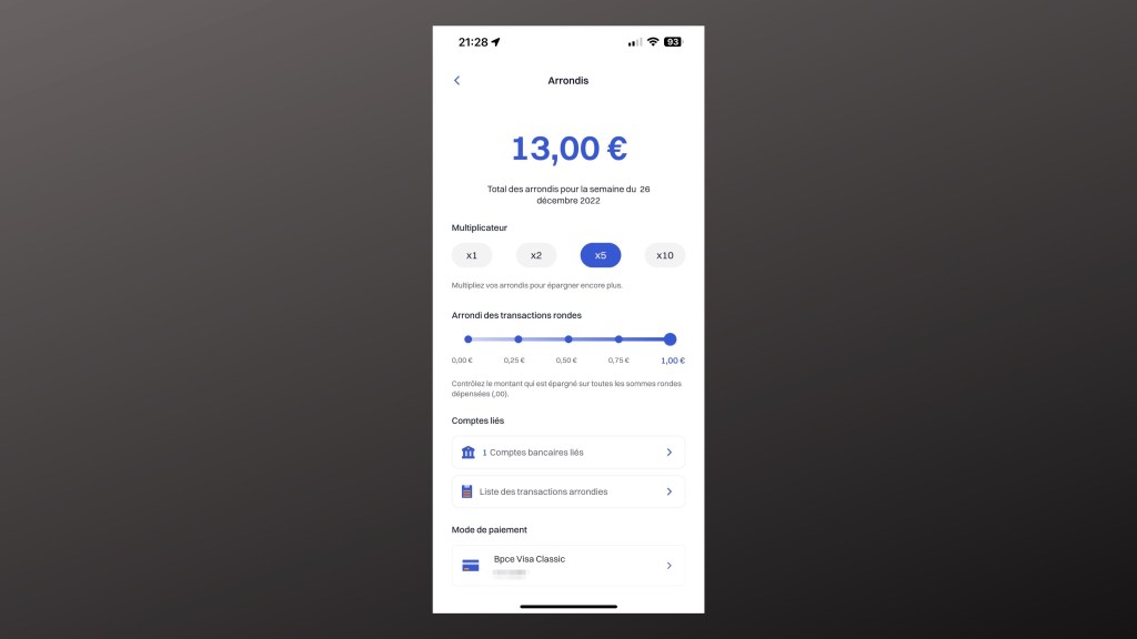 En effet , si vous souhaitez épargner de très petites sommes chaque semaine, alors vous laisserez l’application dans ses réglages d’origine, mais au contraire si vous êtes un peu plus à l’aise financièrement, vous pourrez augmenter ces arrondis de plusieurs façons différentes.