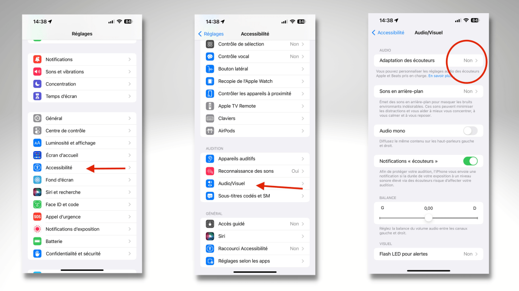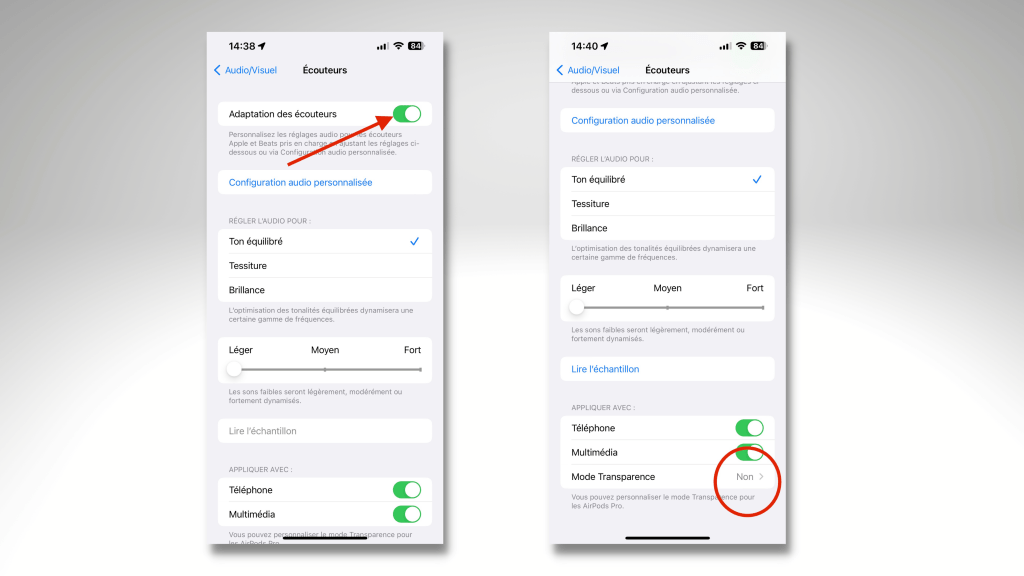 – Allez dans la première section Adaptation des écouteurs et enclenchez la fonction.