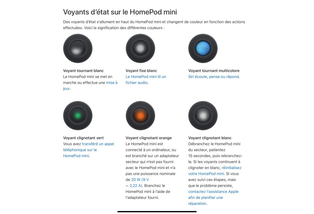 - Voyant clignotant orange : Cette animation peut apparaître sur votre HomePod mini dès lors qu’il est connecté à un ordinateur ou à un adaptateur secteur qui ne lui fournit pas la puissance nominale nécessaire à son bon fonctionnement ( 20 W / 9 V , 2,22 A ). Dans ce cas, Apple recommande de brancher l’enceinte avec l’adaptateur secteur fourni lors de son achat.