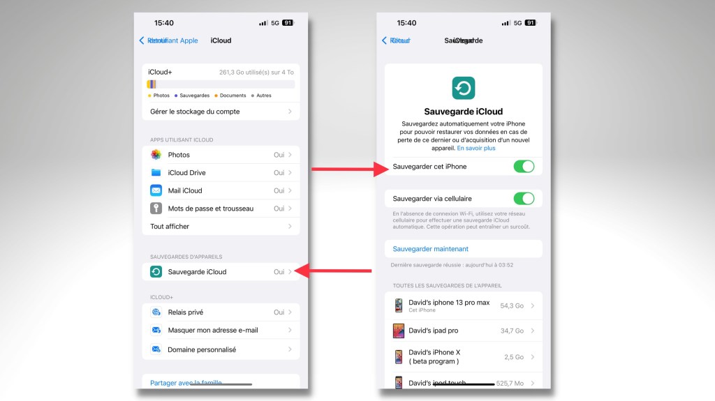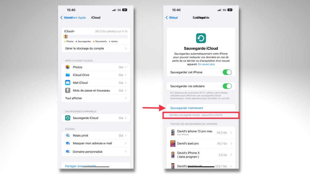 Vous verrez alors la date et l’heure de la dernière sauvegarde effectuée. Si cela fait un certain temps que vous n’avez pas sauvegardé votre iPhone, vous pouvez appuyer sur « Sauvegarder maintenant » pour lancer une sauvegarde manuelle.