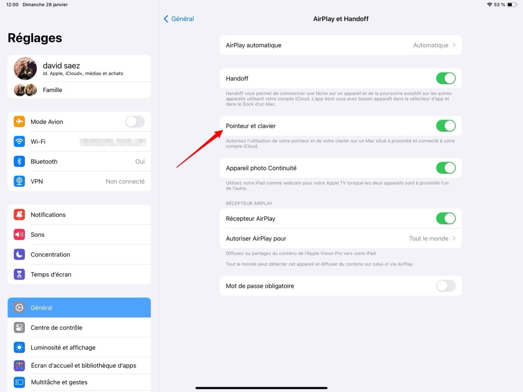 – Activez l’option Pointeur et clavier ( cette option n’est bien-sûr disponible que sur les modèles d’iPad compatibles avec la fonctionnalité Commande Universelle )