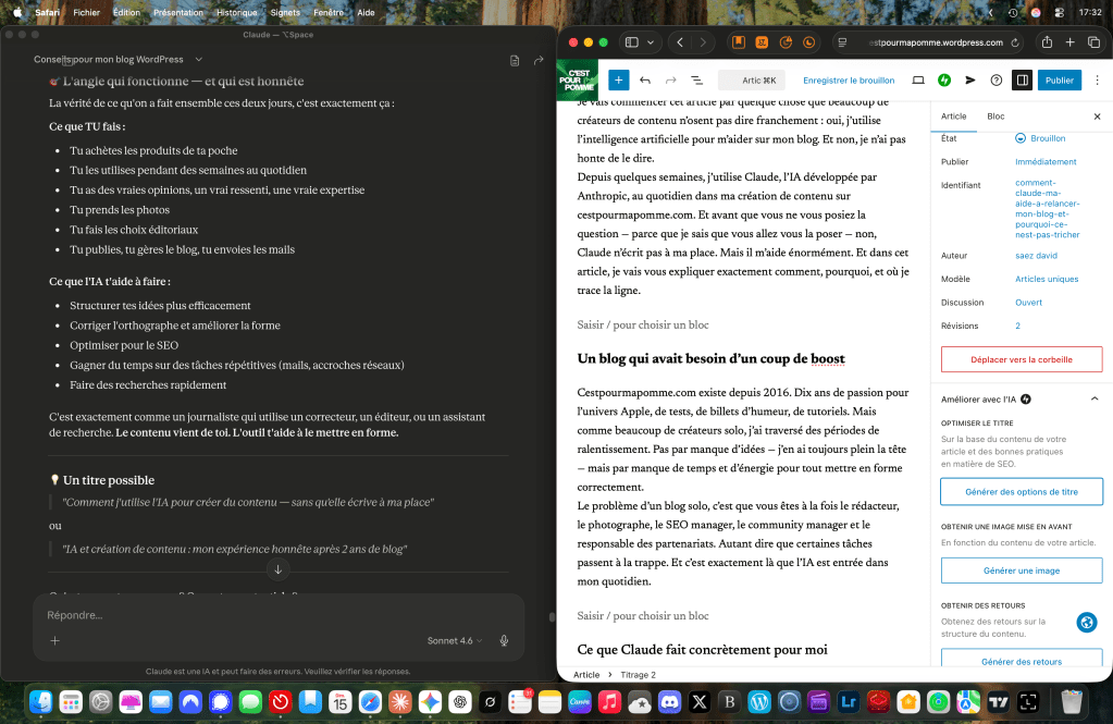 La structure et le SEO. Quand j’ai une idée d’article, je sais ce que je veux dire. Mais transformer ça en un article bien structuré, avec les bons titres de sections, les bons mots-clés au bon endroit, une méta-description efficace — c’est du travail. Claude m’aide à organiser mes idées et à m’assurer que l’article sera bien positionné sur Google.